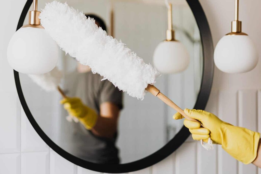 - Quitar polvo de estanterías, mesas, ventanas interiores y objetos decorativos.